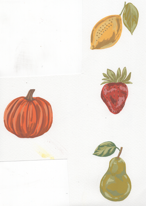 Hand painted with gouache. Ditsy fruit n veg print developed for embroidery and digital print.